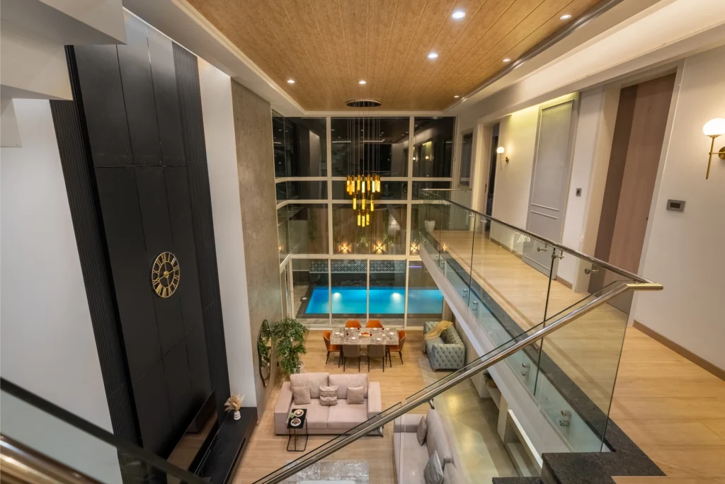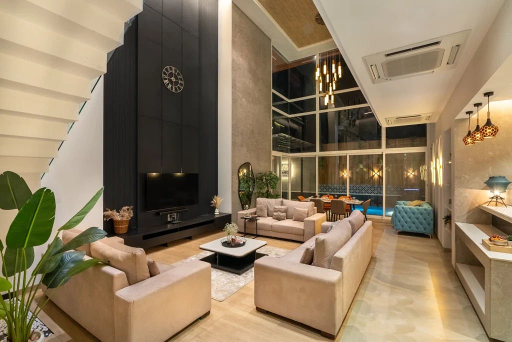 - Enter into a spacious AC living room with tall glass windows framing the poolside.