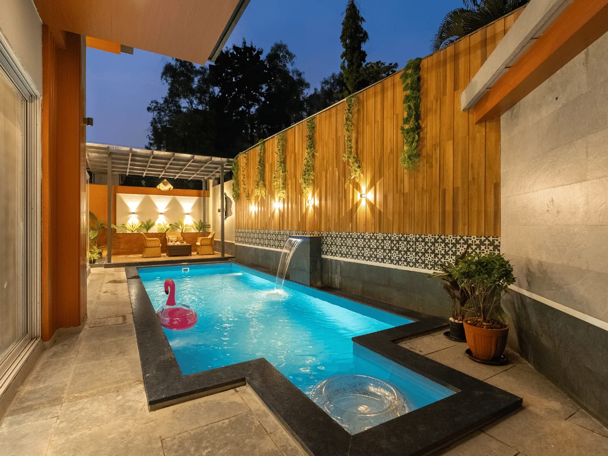Bring along your furry friends for a comfortable getaway at this pet-friendly villa in Lonavala. Maison Bellevue has 6 bedrooms, each designed in a distinct style, cohesively coming together to form a beautiful holiday home. The villa has three floors and an open terrace on top. There is a private pool outside with a cosy cabana space, wooden chair seating, highlighted by a white macrame swing on one side. This 6BHK villa in Lonavala is perfect for family getaways, offering ensuite bedrooms, spacious common areas, and a private poolside dining setup for memorable gatherings.