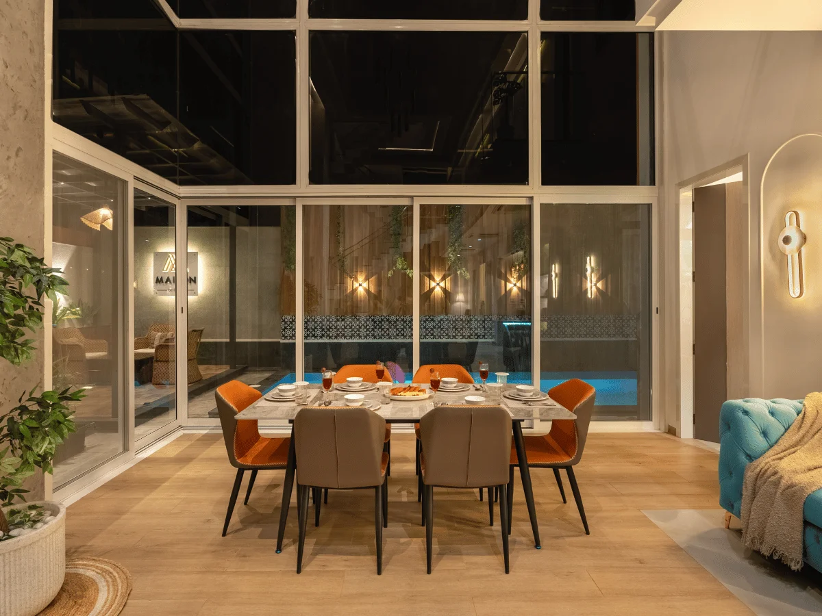 - A dining setup right near the poolside windows ensures you enjoy your meals with poolside bliss.