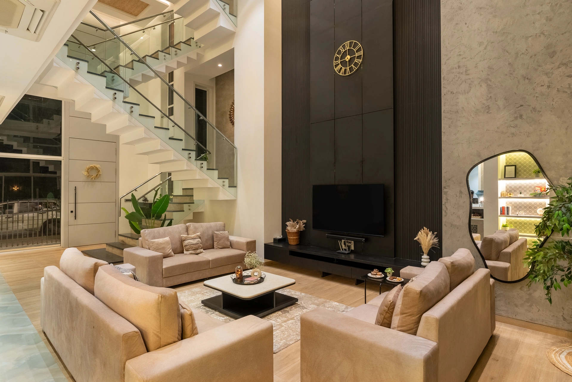- A flow mirror in the living room adds to the elegance of the stylish interiors.