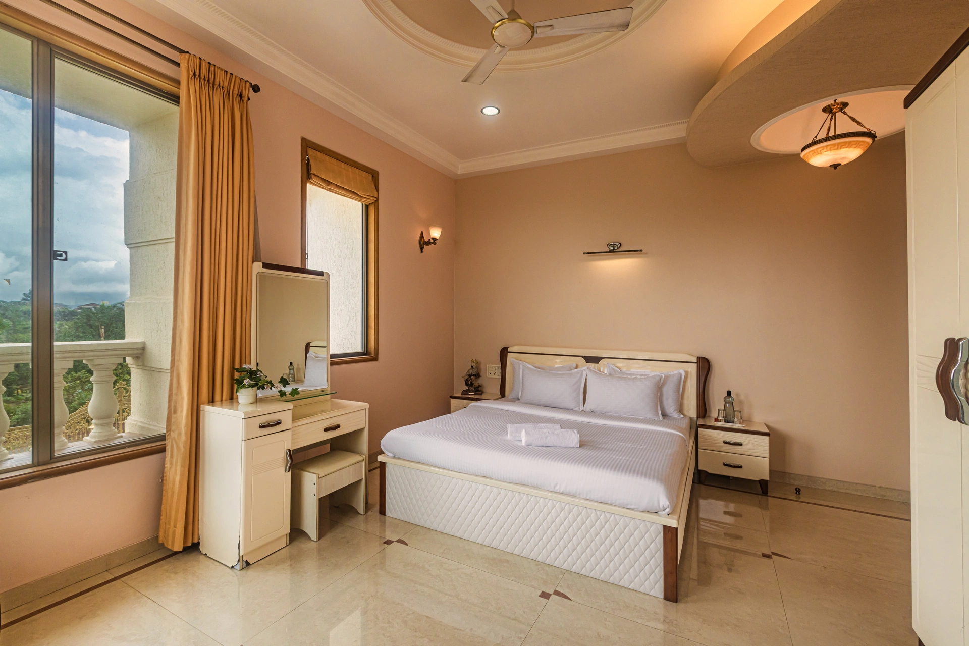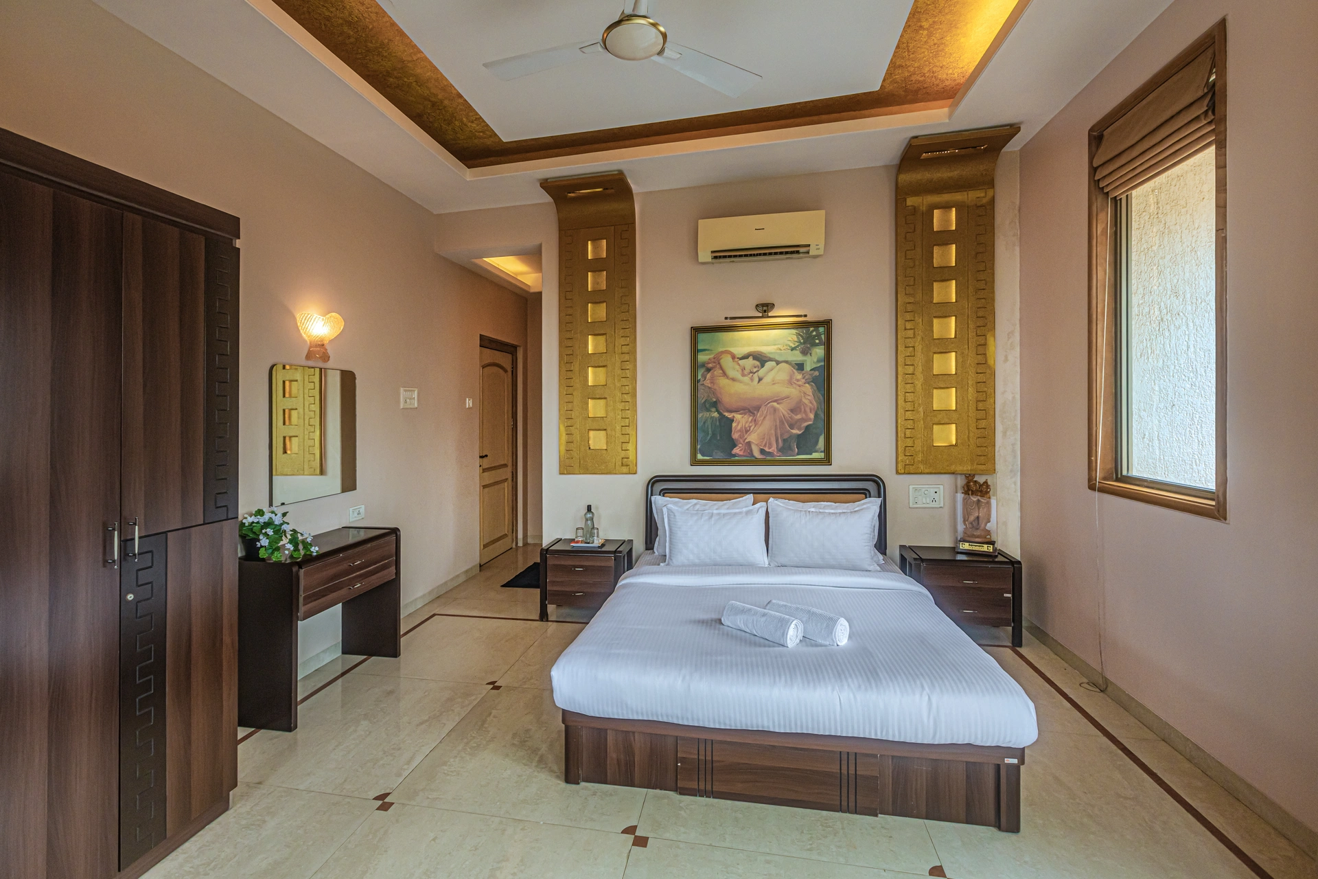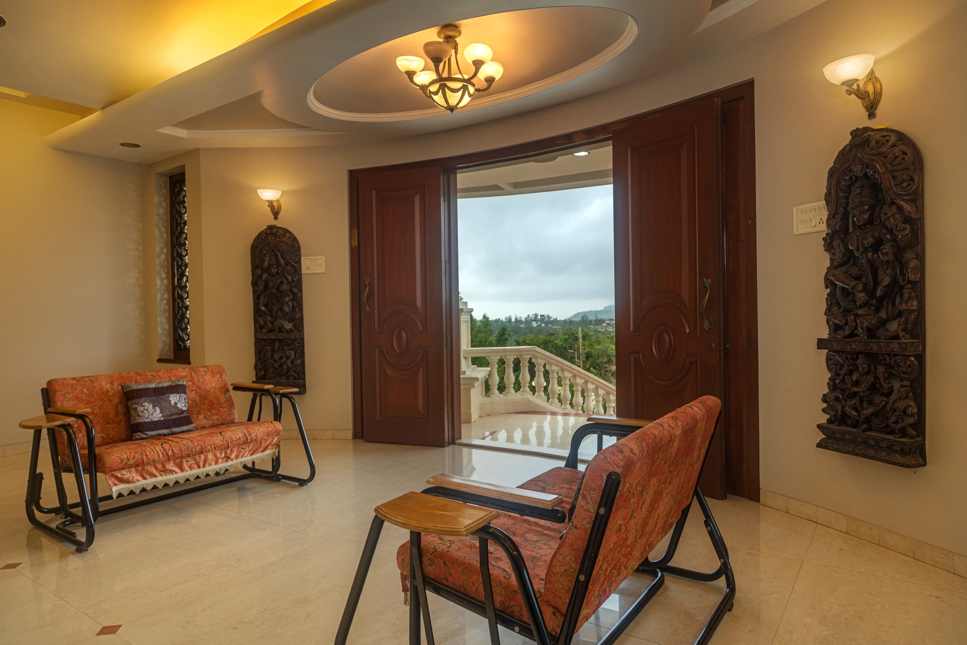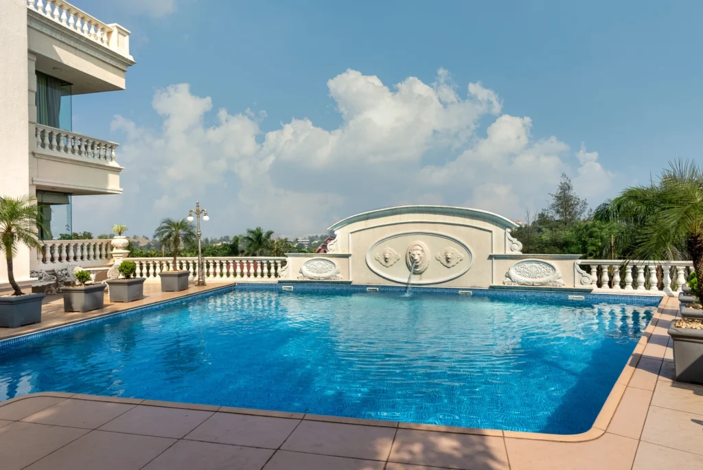 A pure veg villa in Lonavala, Stayscape Mansion charms with its palatial design. A grand staircase entrance, open spaces, two living rooms, plush furnishings and art on the bedroom walls, this villa sets the tone for grandeur in every corner. The interiors beautifully offer a mix of royal and modern design. A swimming pool with a lion-head spout, a jacuzzi, sprawling lawns on either side of the entrance, and views of the mountain valleys in the surroundings from the terrace, spend a luxurious getaway in Lonavala at this elite private residence.
