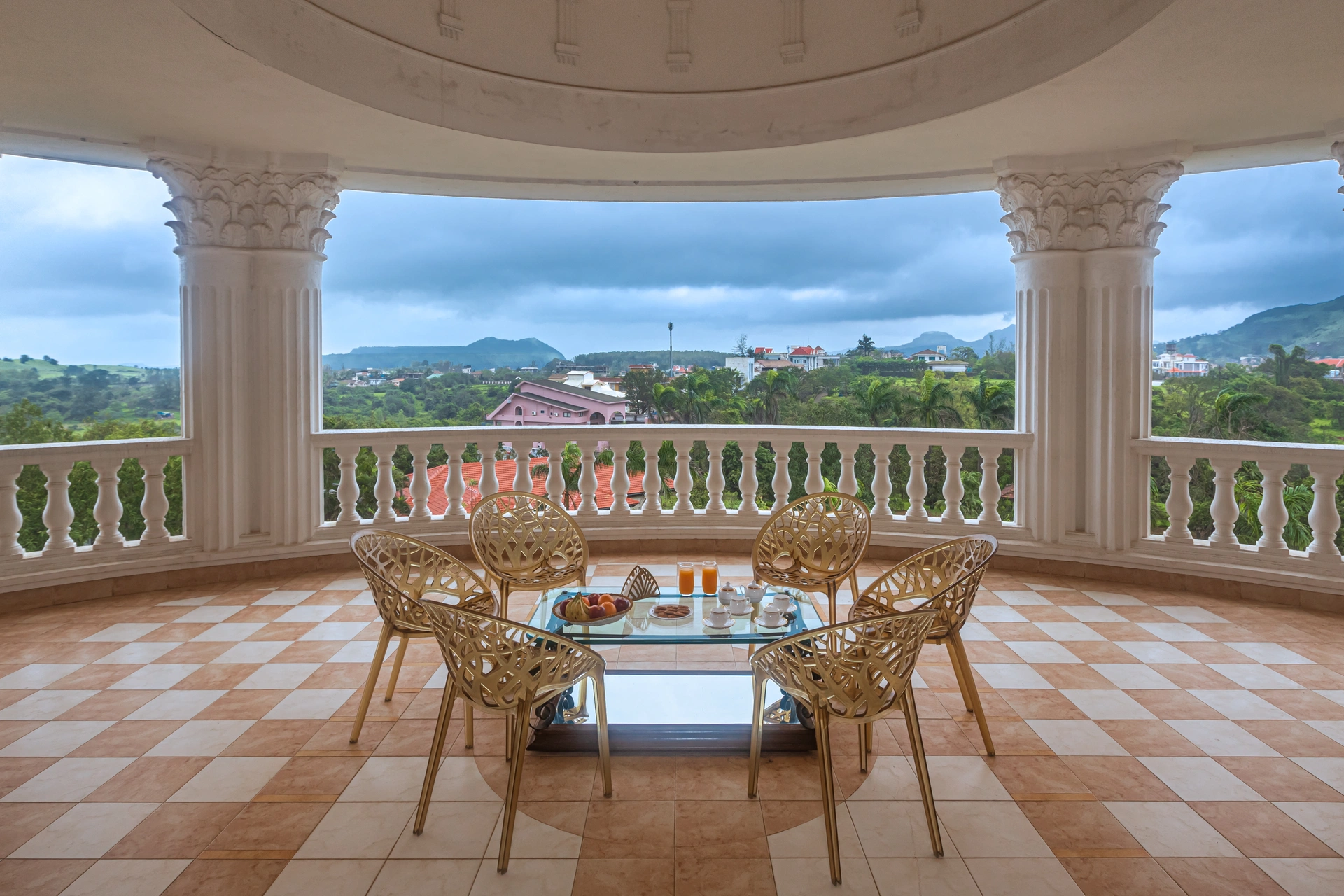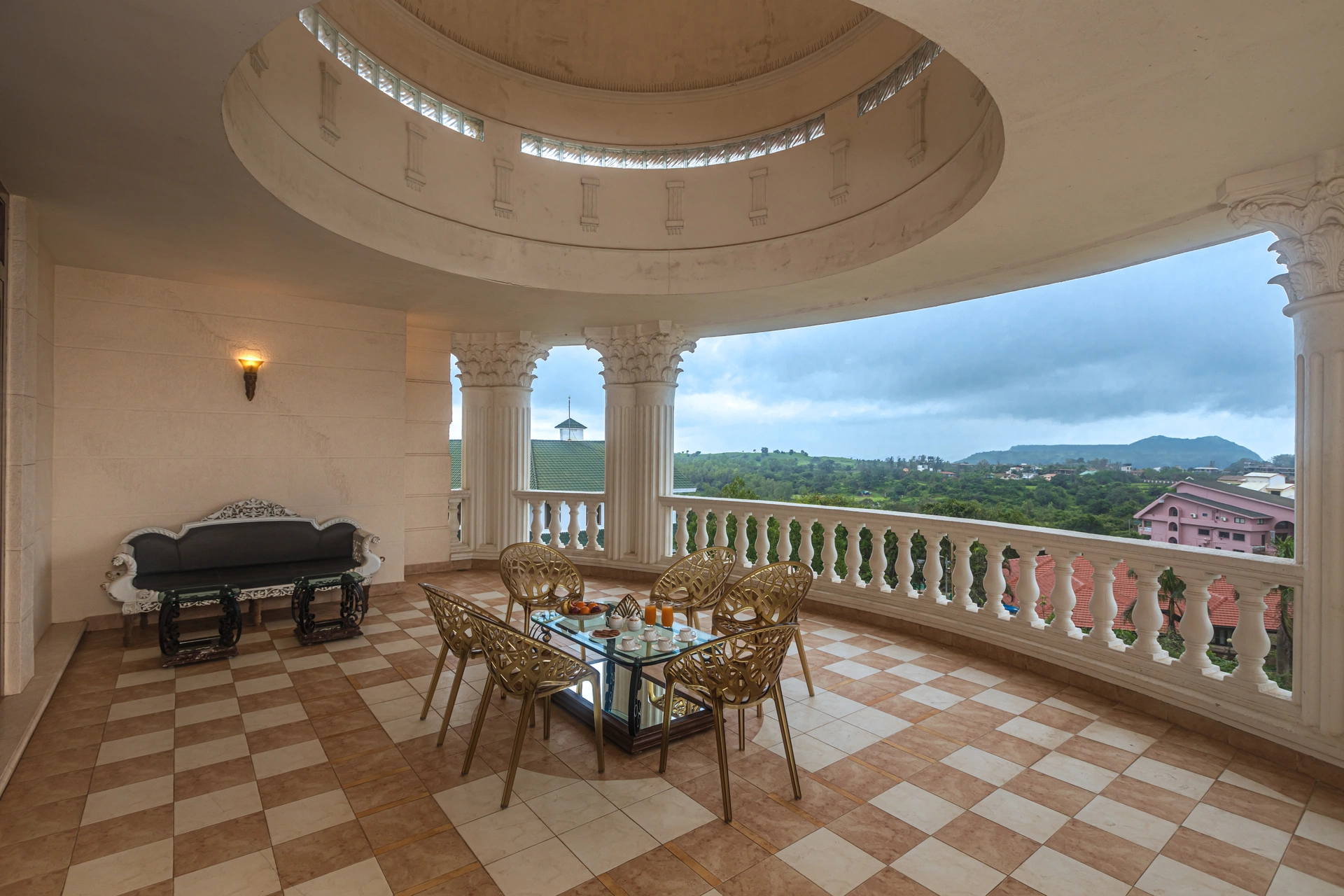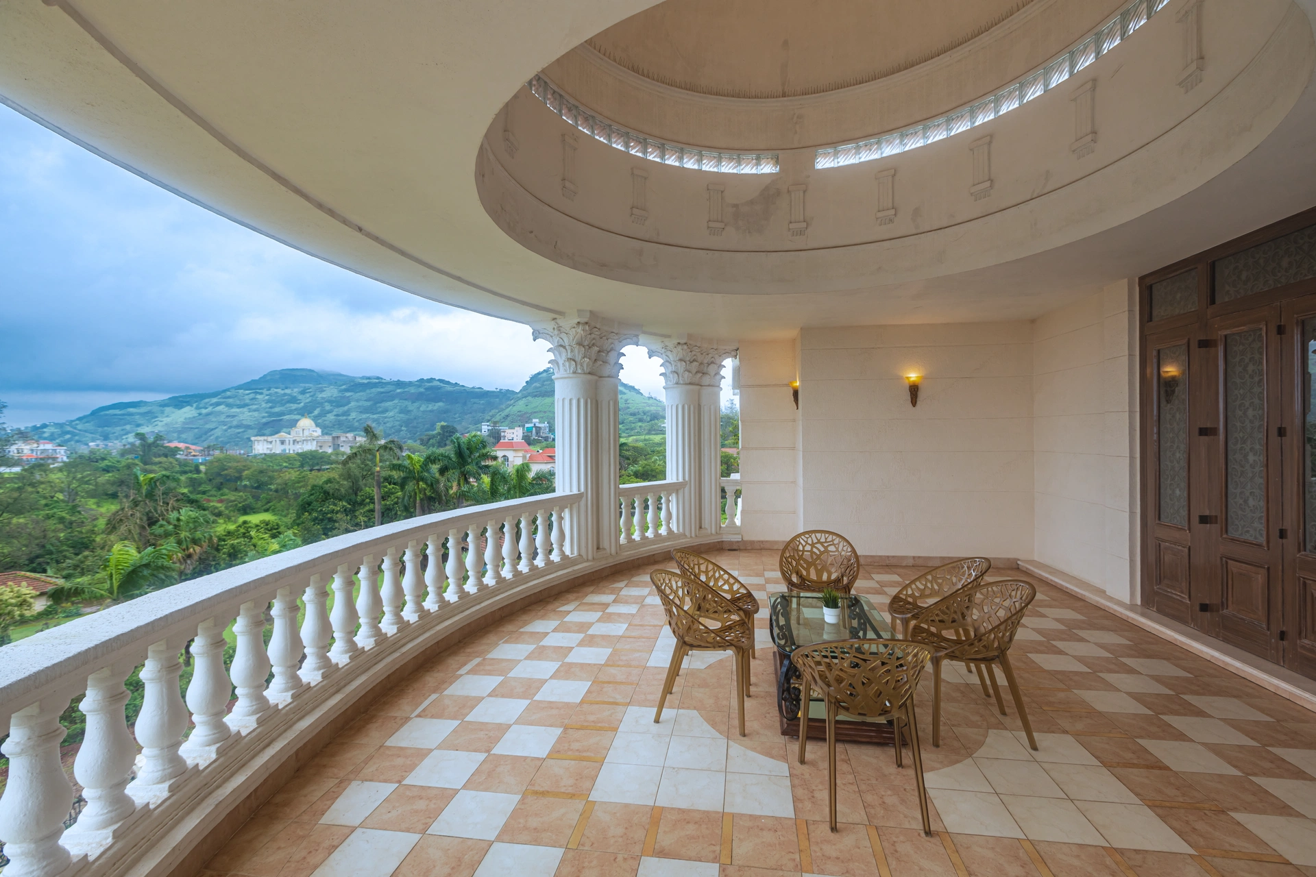- Spacious balcony with seating under the dome roof, offering panoramic views from the surrounding open terrace.