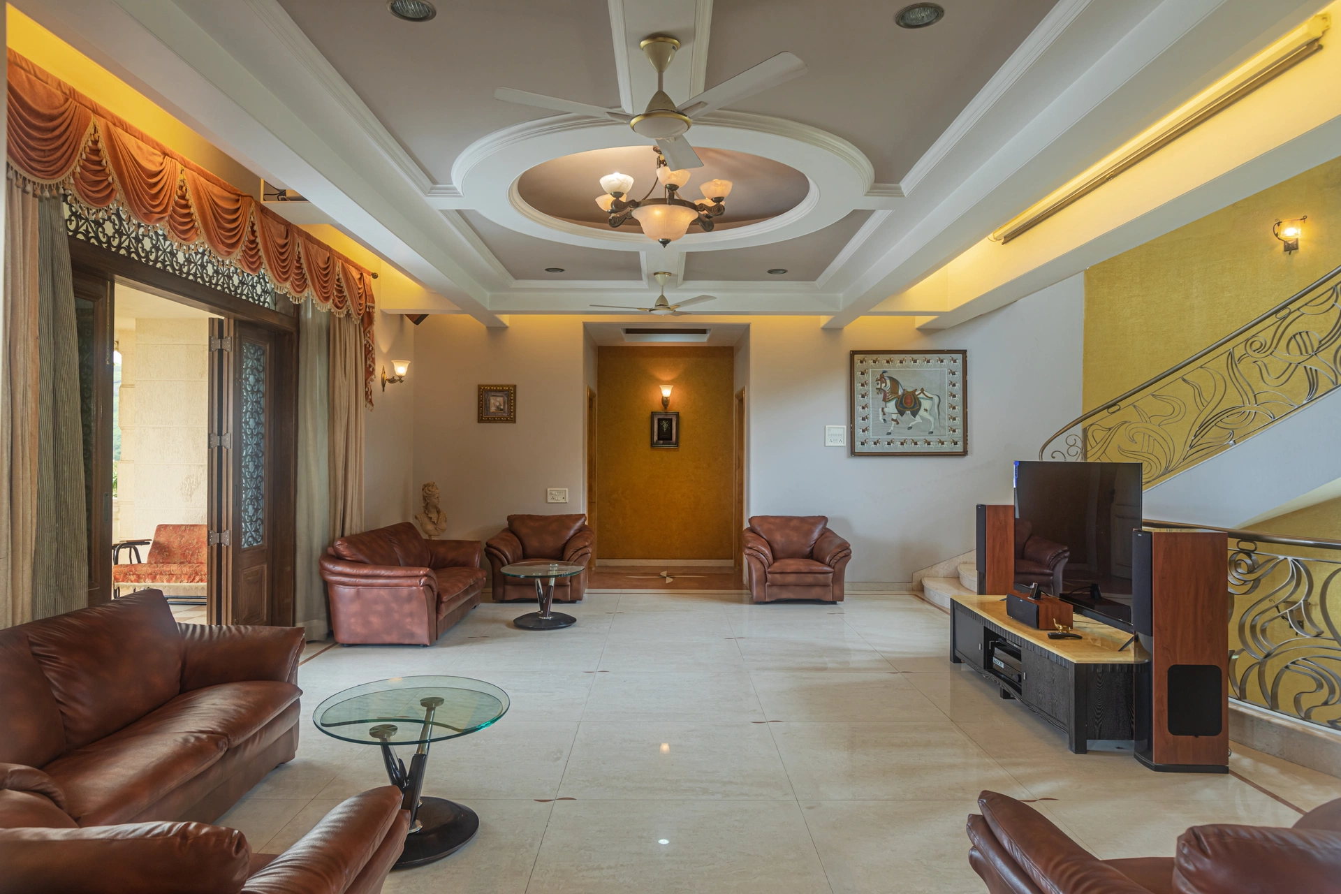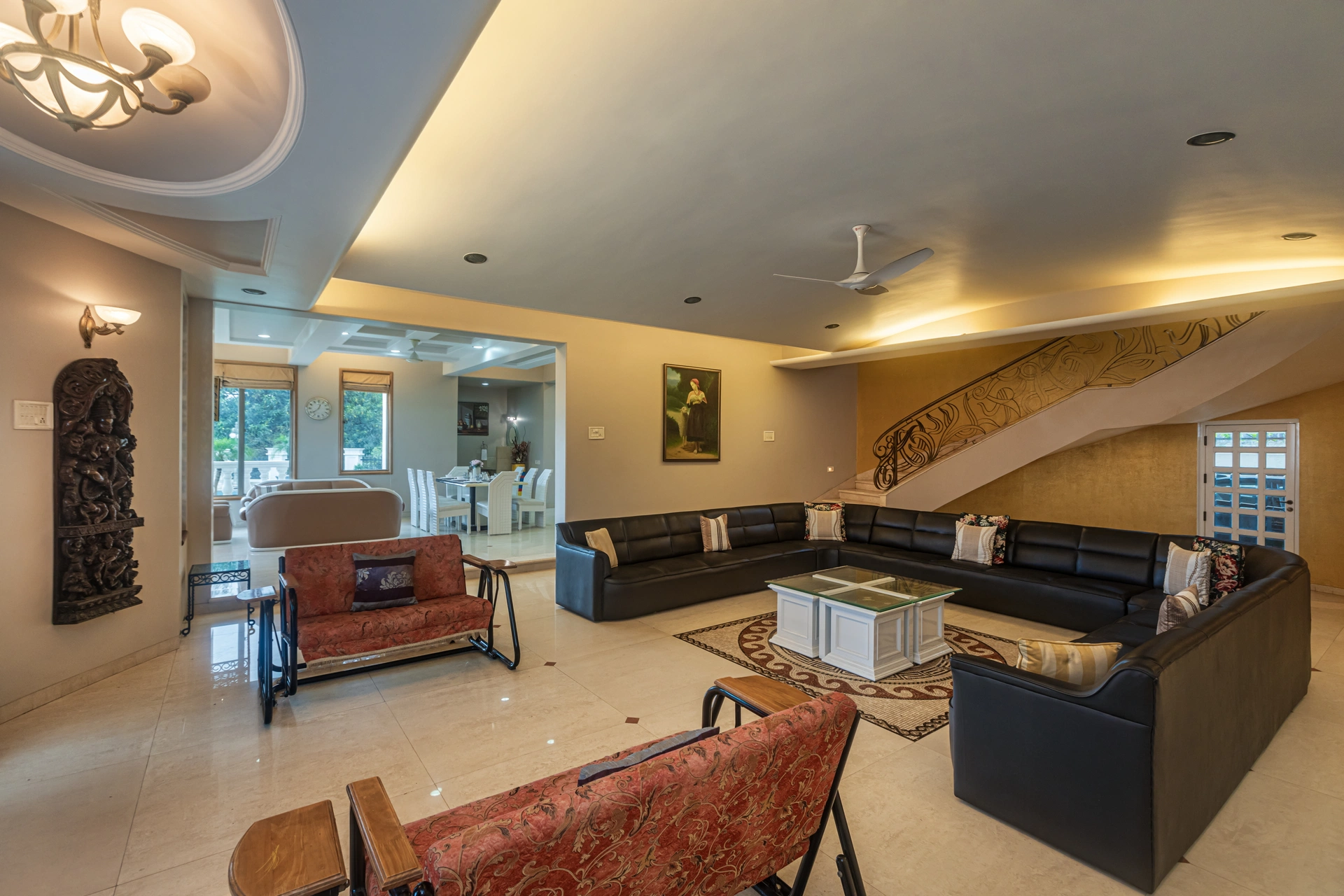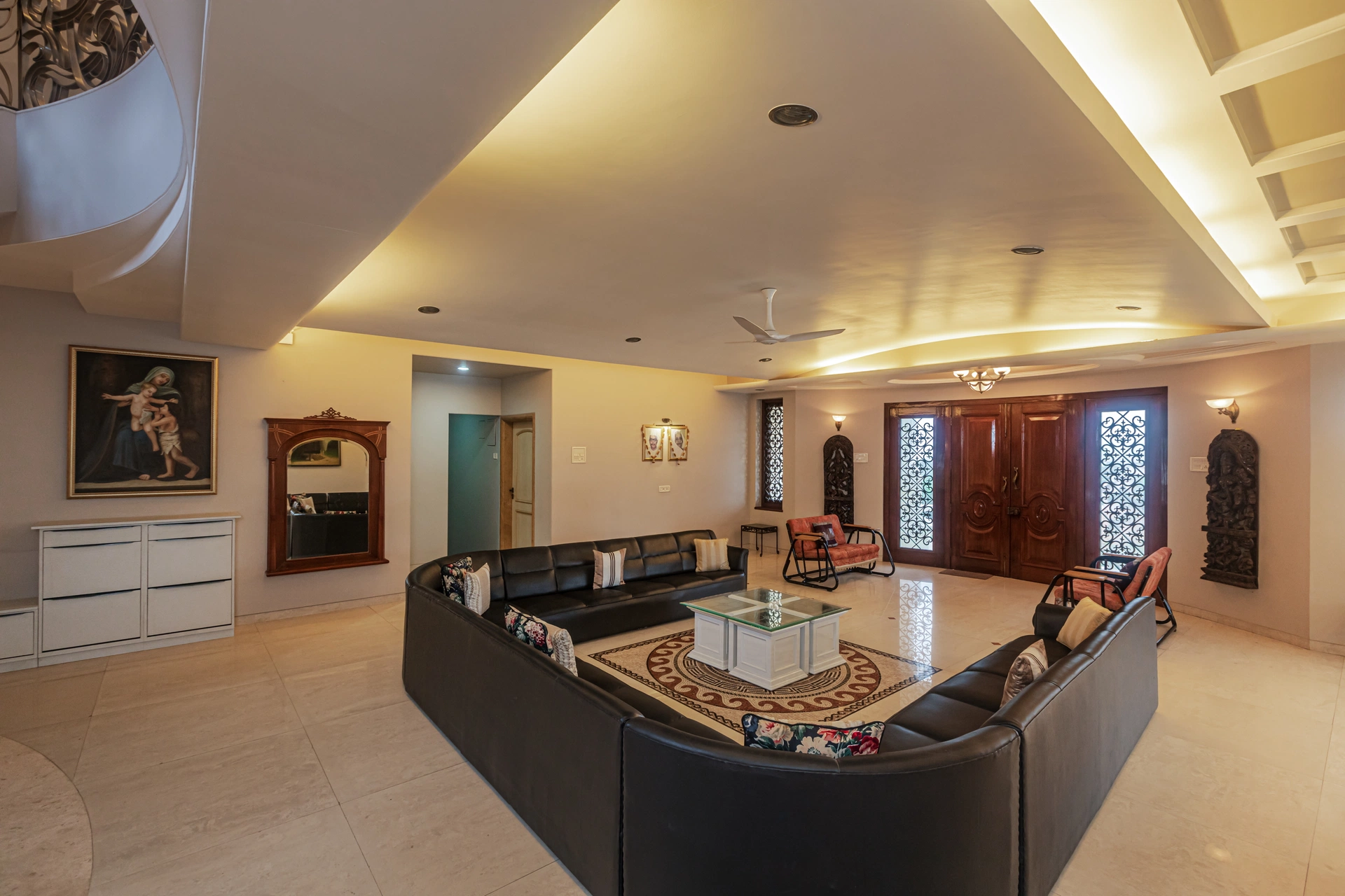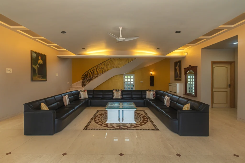 - Ascend the stairs from the main gate to reach the spacious living room with ample seating and dining space.