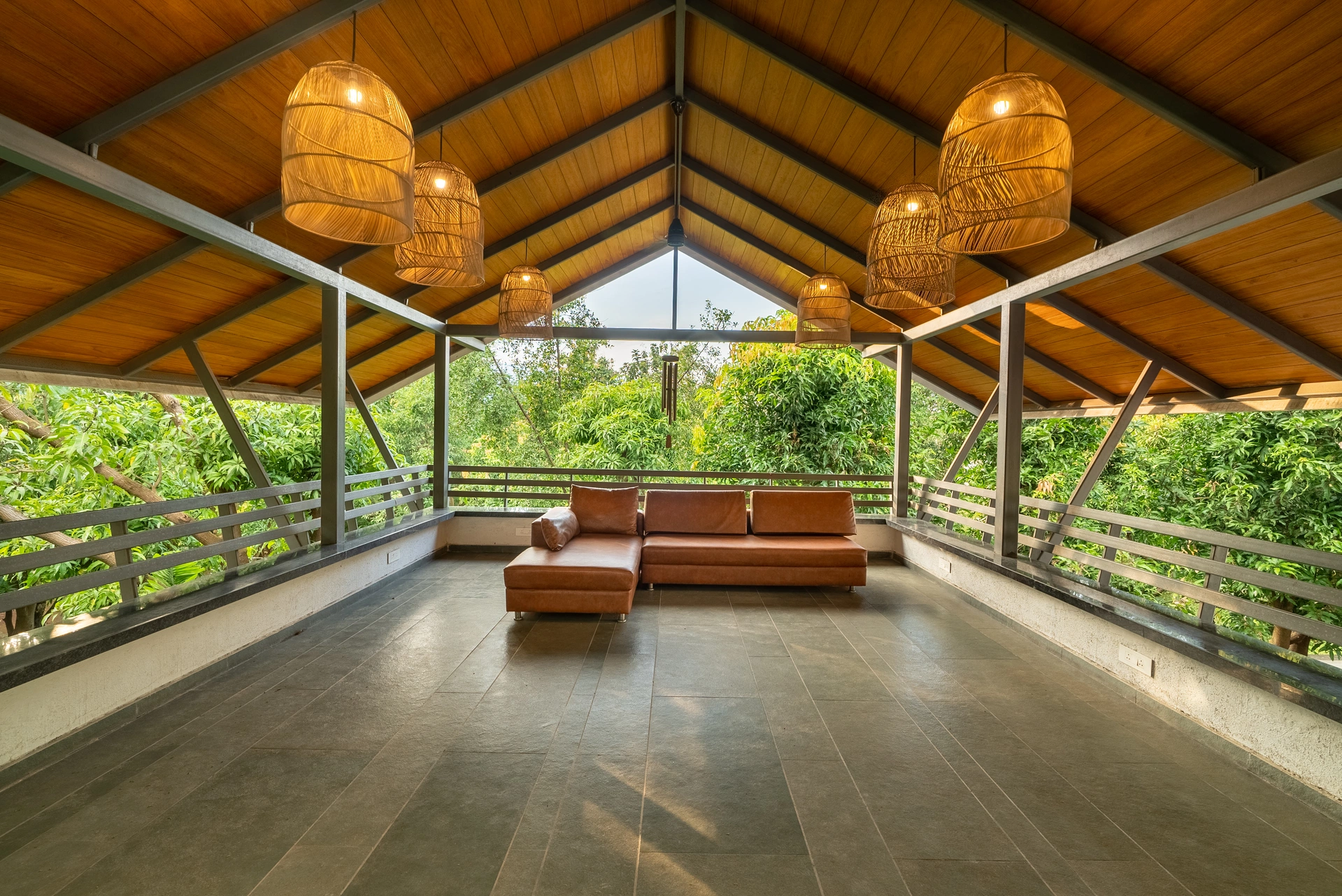 - A gazebo structure on the first level overlooks the lush surroundings. It has comfortable sofa seating