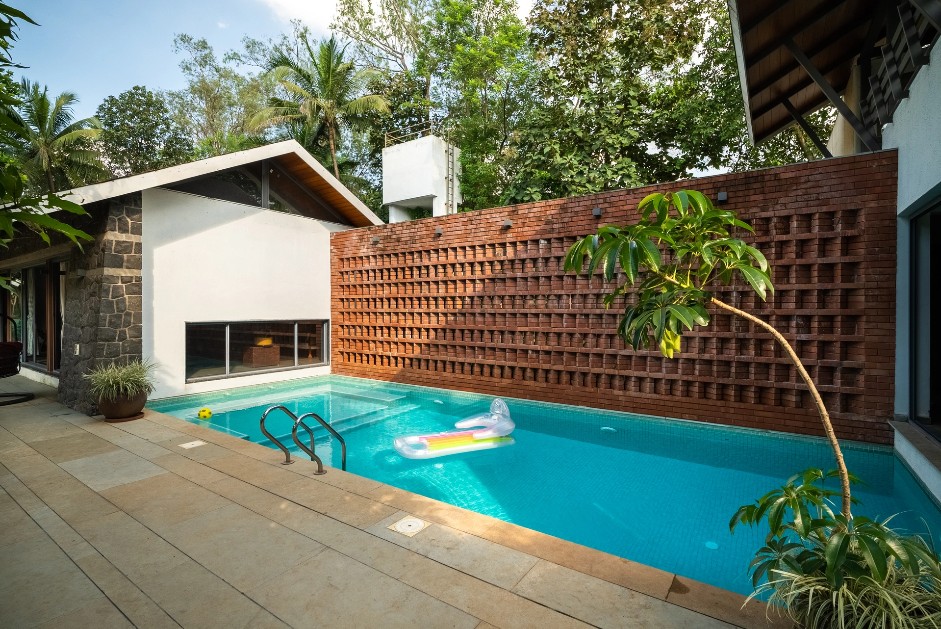 Imagine a space where bohemian vibes meet traditional stone architecture – that’s Saltwater villa in Karjat for you. A senior citizen-friendly villa, it has 4 bedrooms, surrounded by lush greenery, landscaped gardens, open courtyards and seamless spaces to gather and unwind. Its heritage elements will evoke a sense of nostalgia. Equipped with a private pool, a spacious garden, a unique gazebo and sports turf, it has something for people of all ages and also welcomes pets.