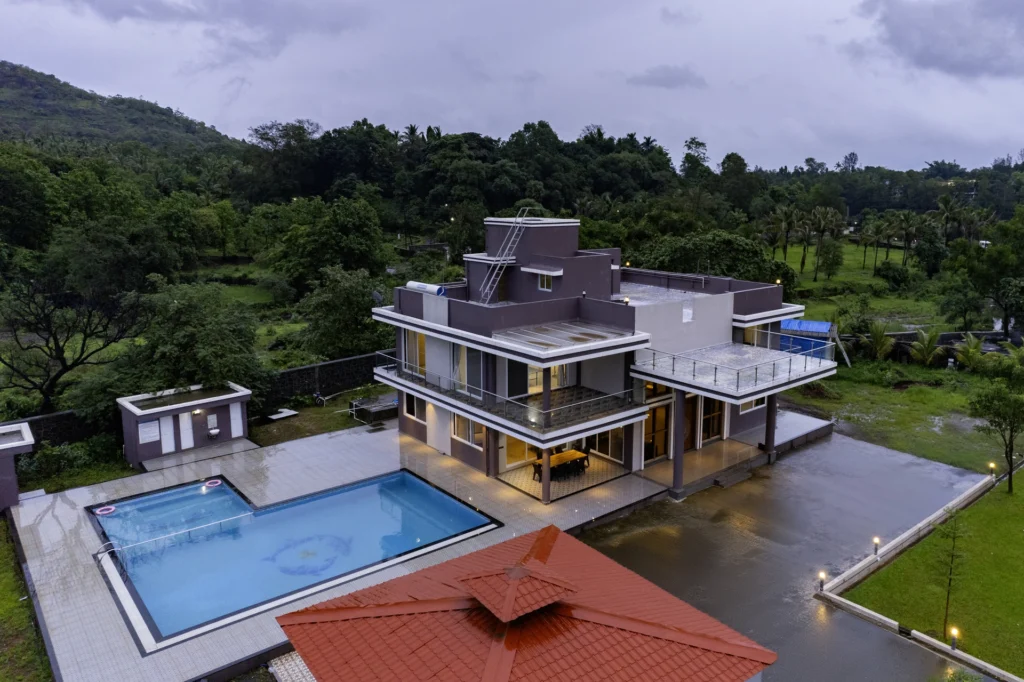 Looking for a farm-style escape with all the luxuries of modern living? Welcome to Shreeji Farms, a 5BHK luxurious villa in Karjat with a pool, set amidst endless stretches of lush greenery. This villa has one of the biggest pools in Karjat (30 feet), an Olympic-sized swimming pool.