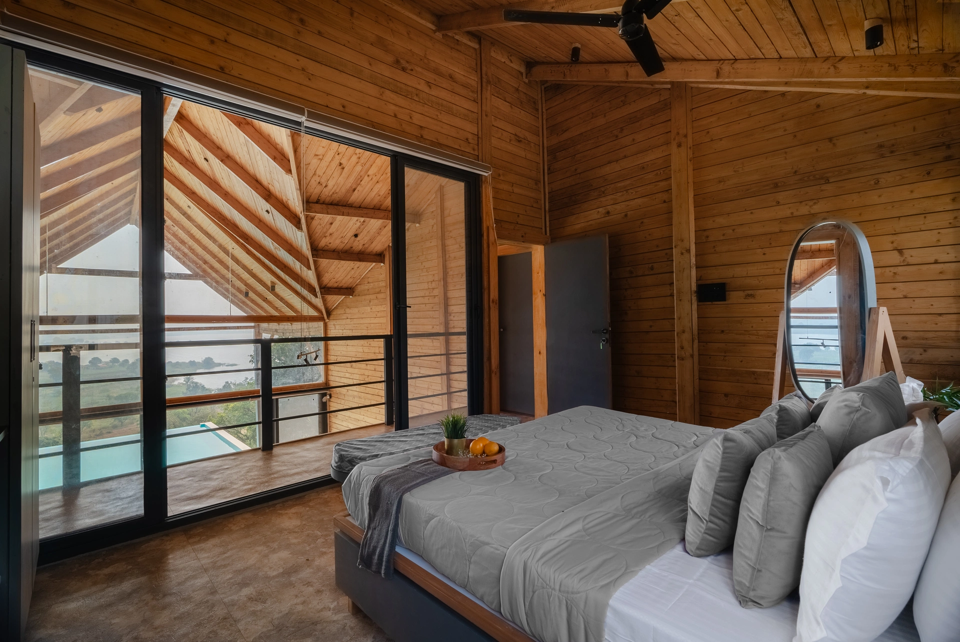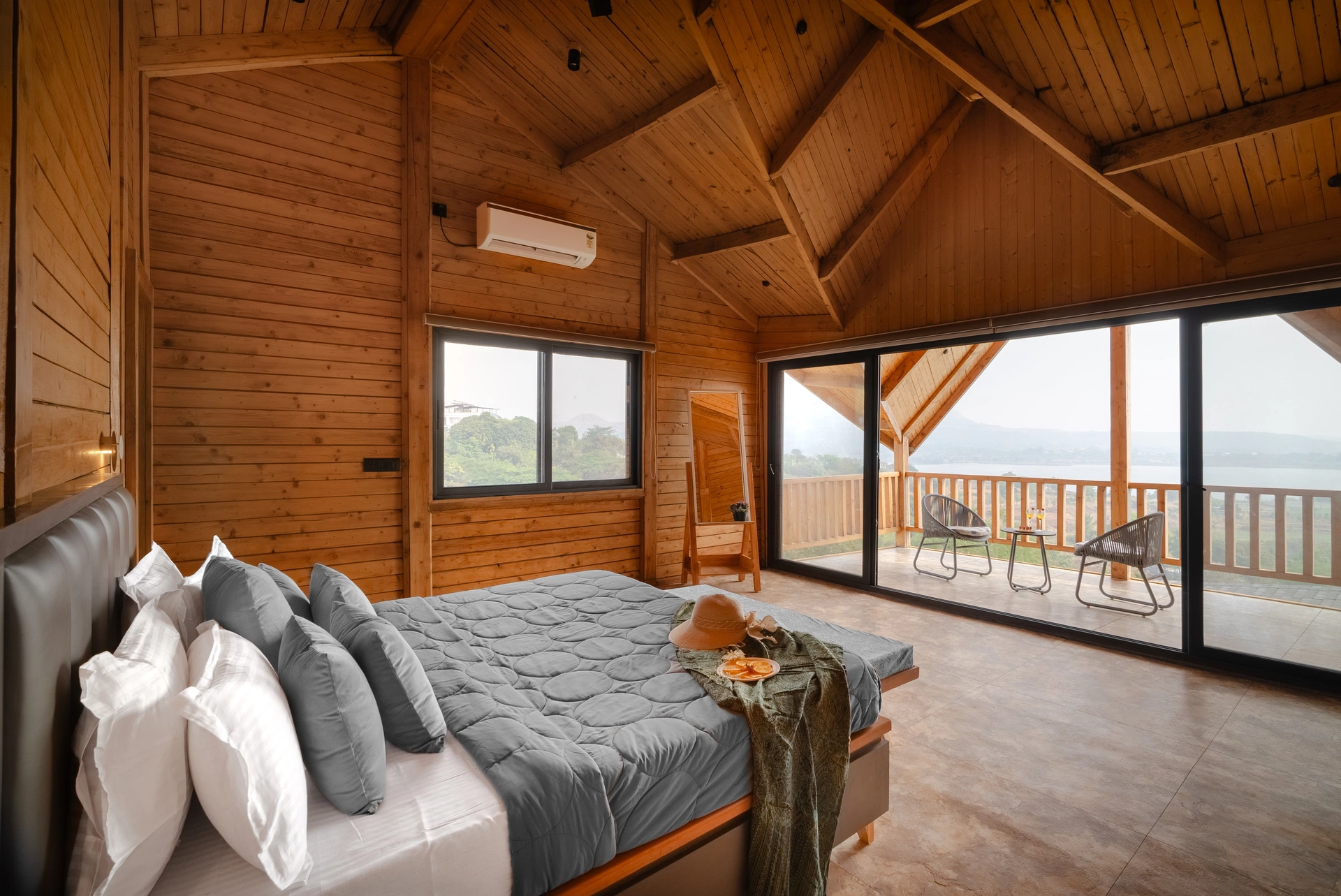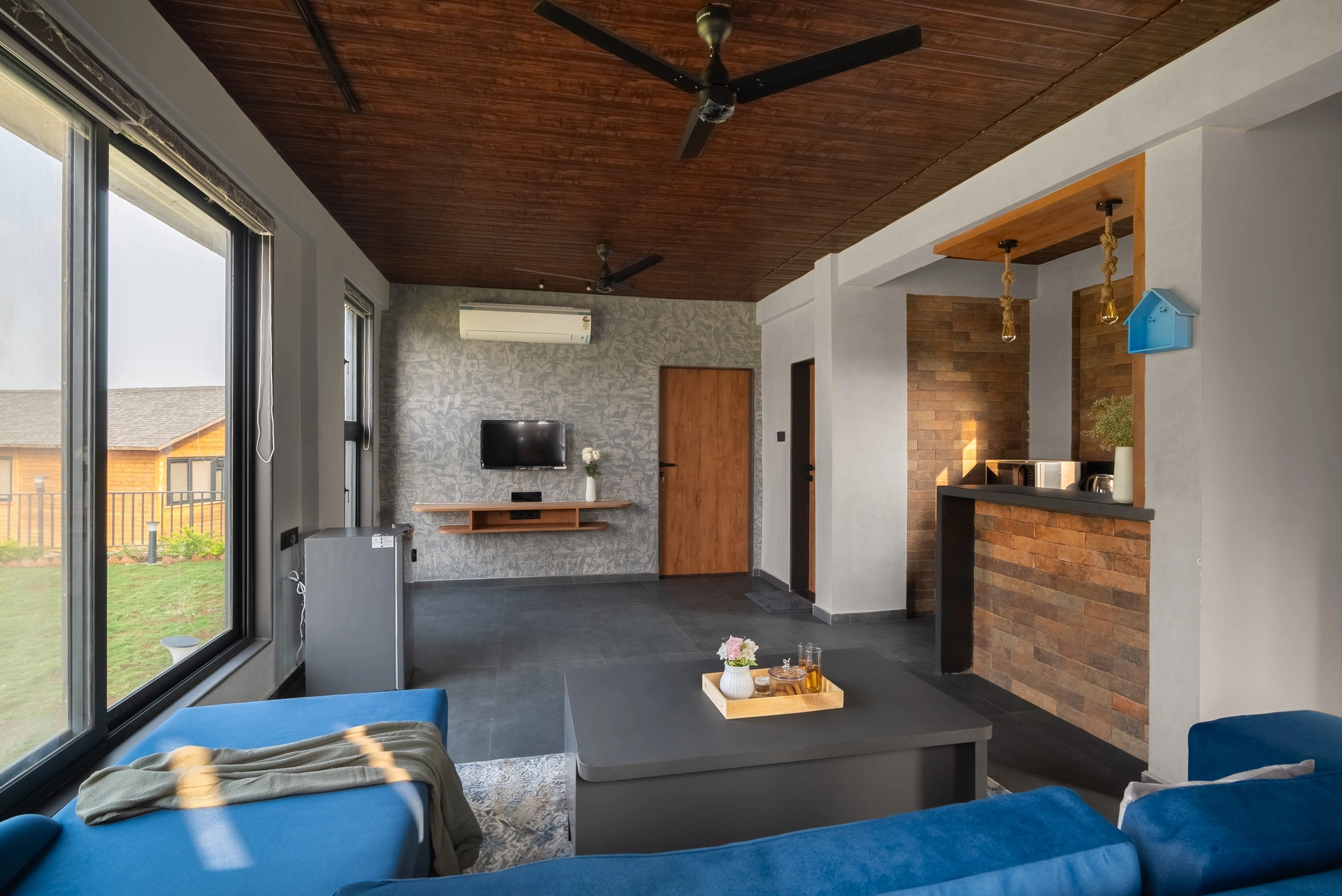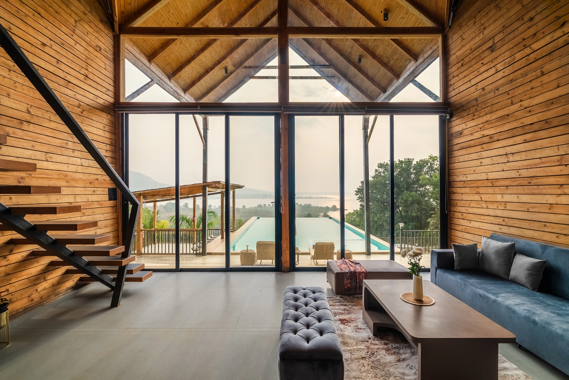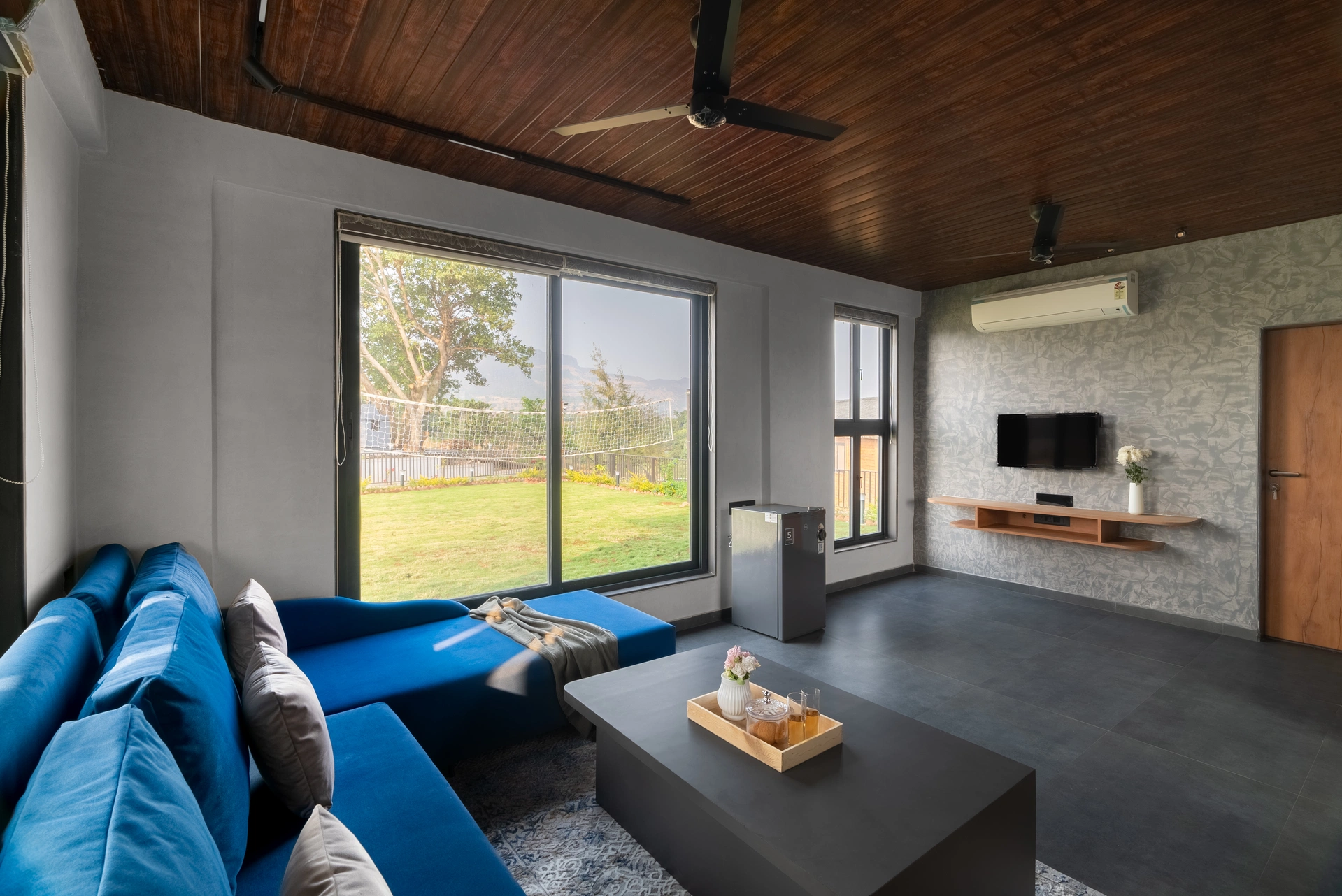 - The suite in this Igatpuri villa has a stylish living room, and the bedroom has a large window facing the lake and lawn view.