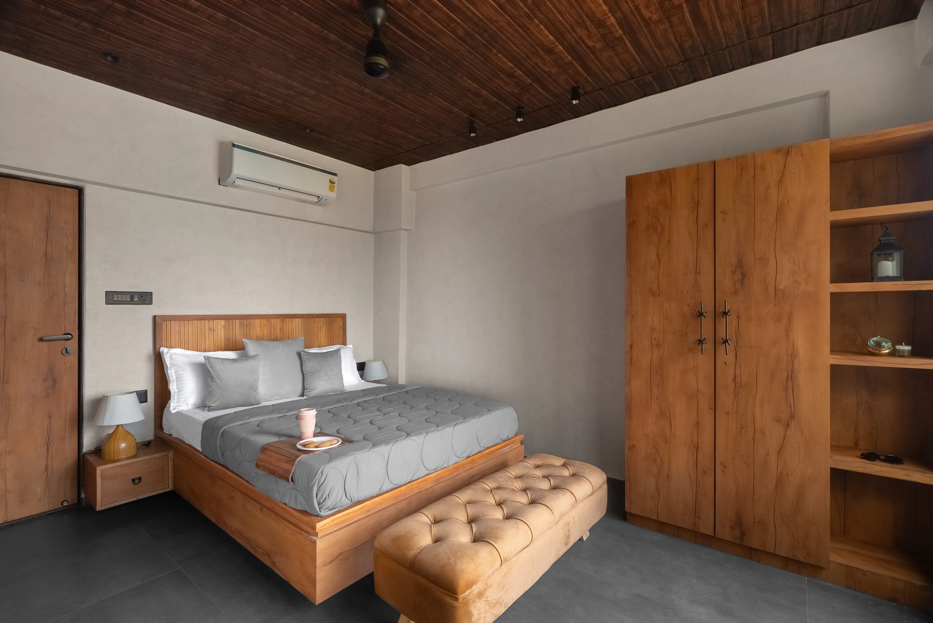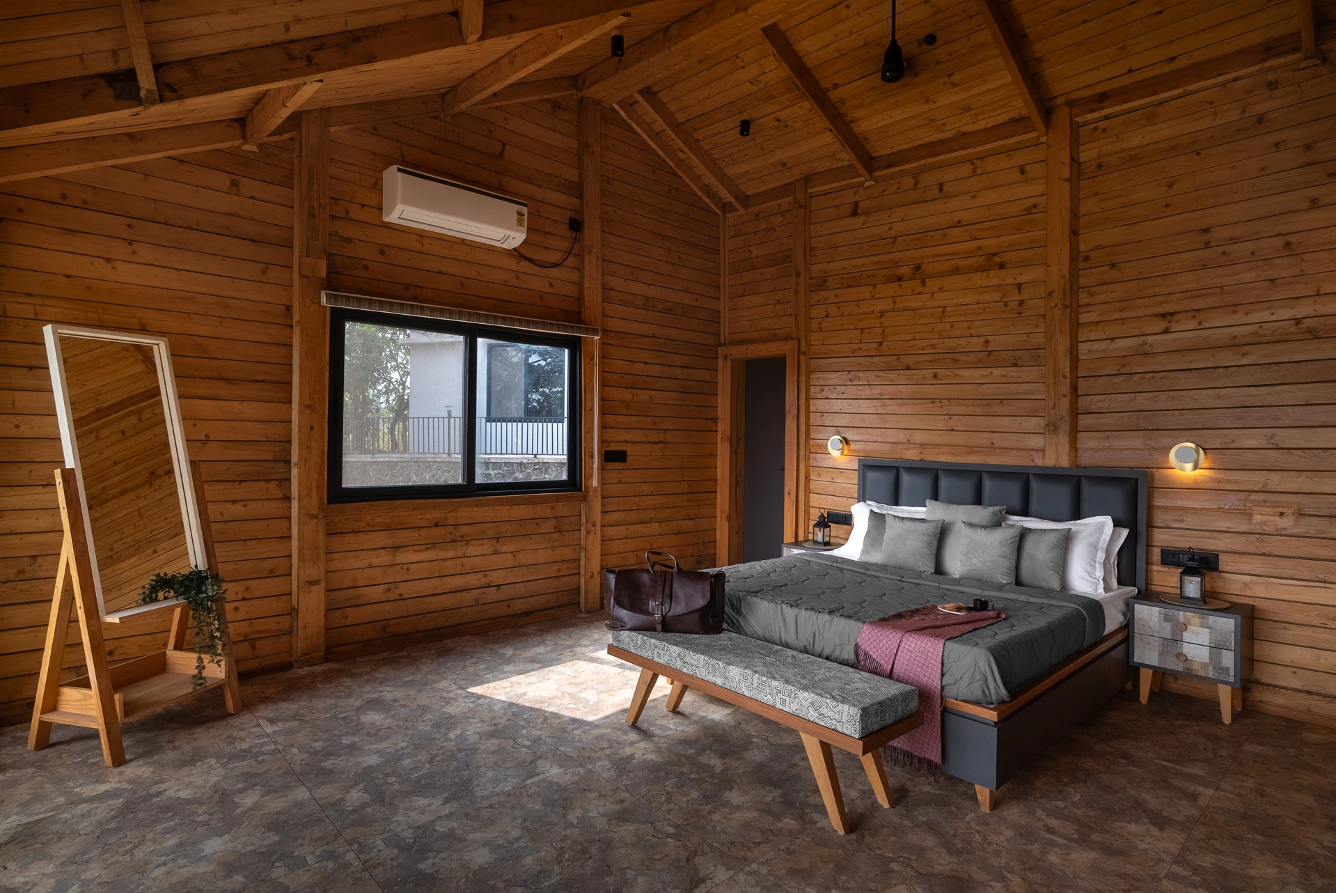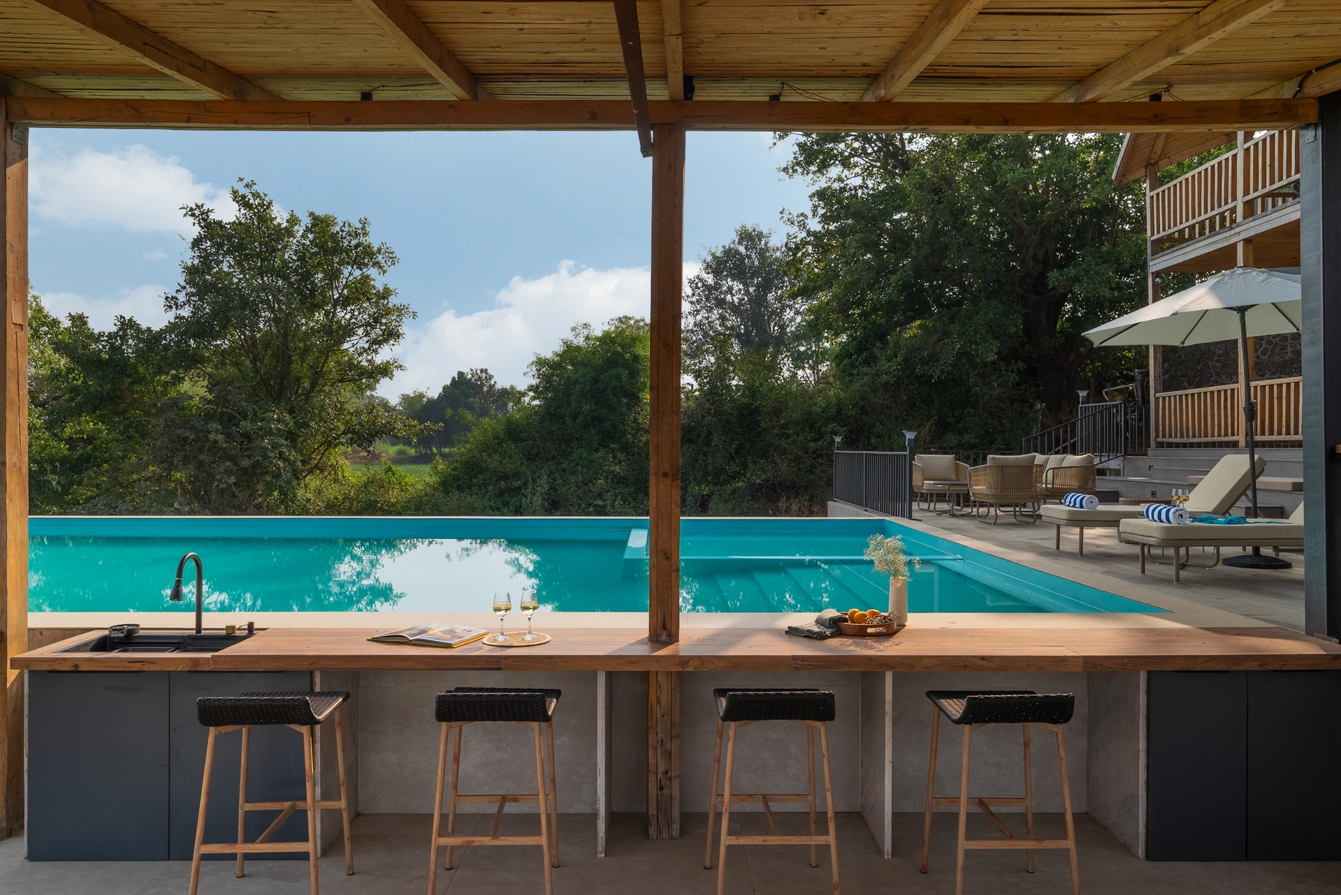 If you’re looking for villas in Igatpuri with infinity pool, this luxurious home is by a pristine lakeside and lush farmlands. Smulstonstalle has a 5-bedroom villa and a separate 1-bedroom suite unit. An architectural masterpiece with elegant wooden interiors, sloped ceilings and tall glass windows looking out to the picturesque landscape of the Vaitarna Lake. An infinity pool with a stylish bar counter on the side, space for barbecue and open outdoor seating spaces, spend unforgettable moments celebrating with your friends and family.