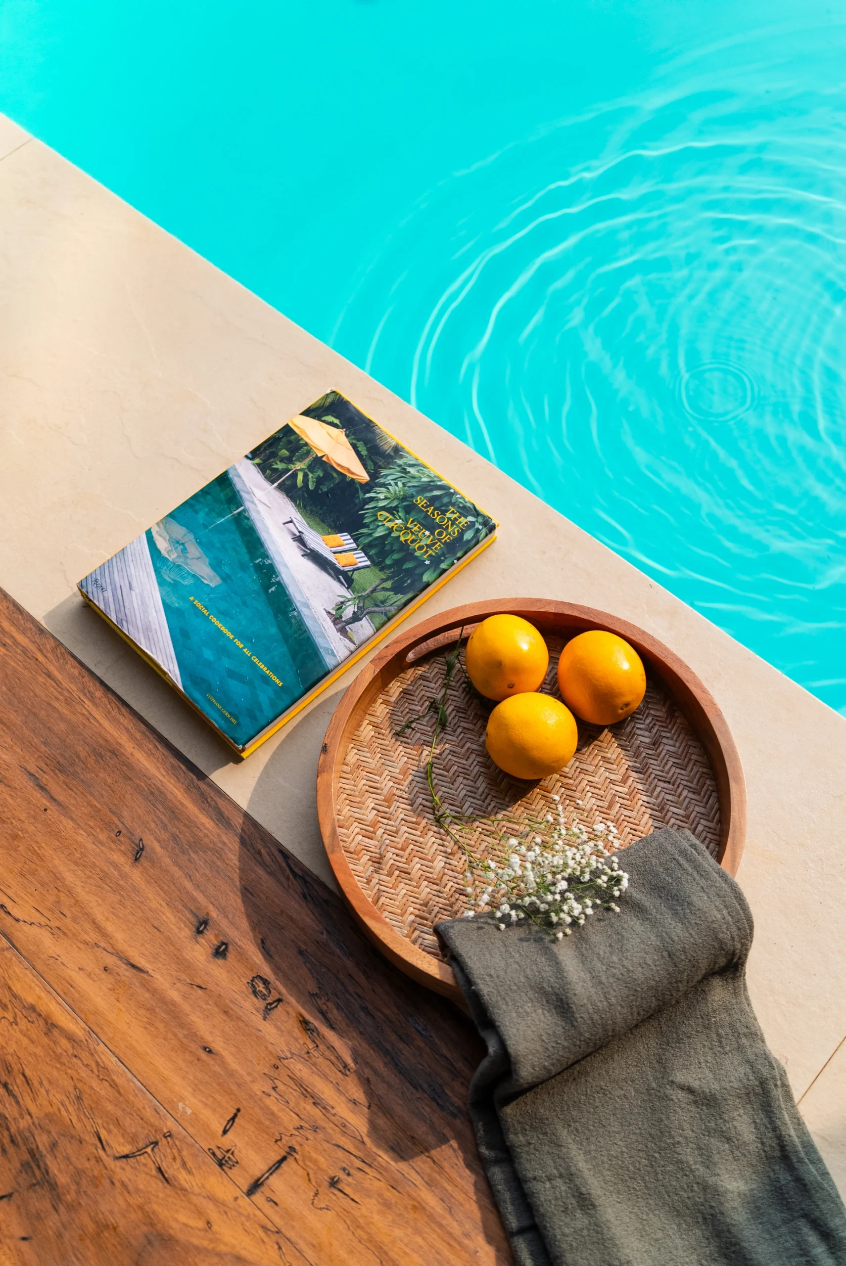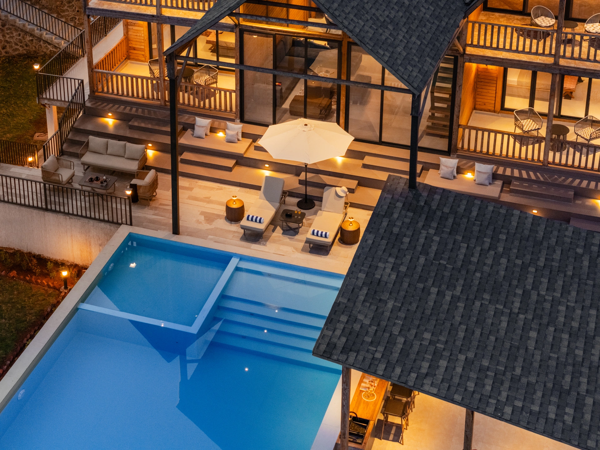 - There are two lawns, one beside the pool, one behind the villa structure.