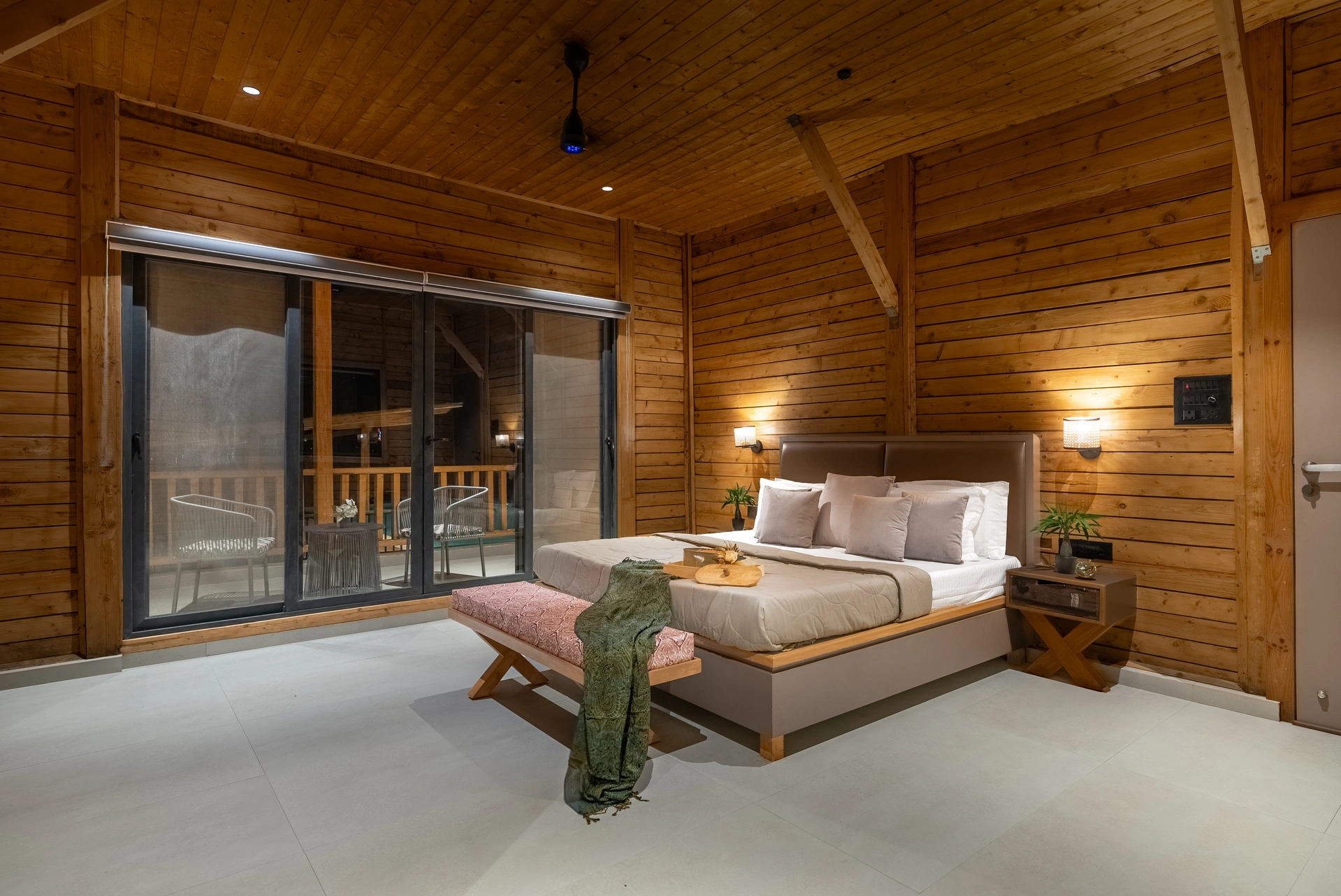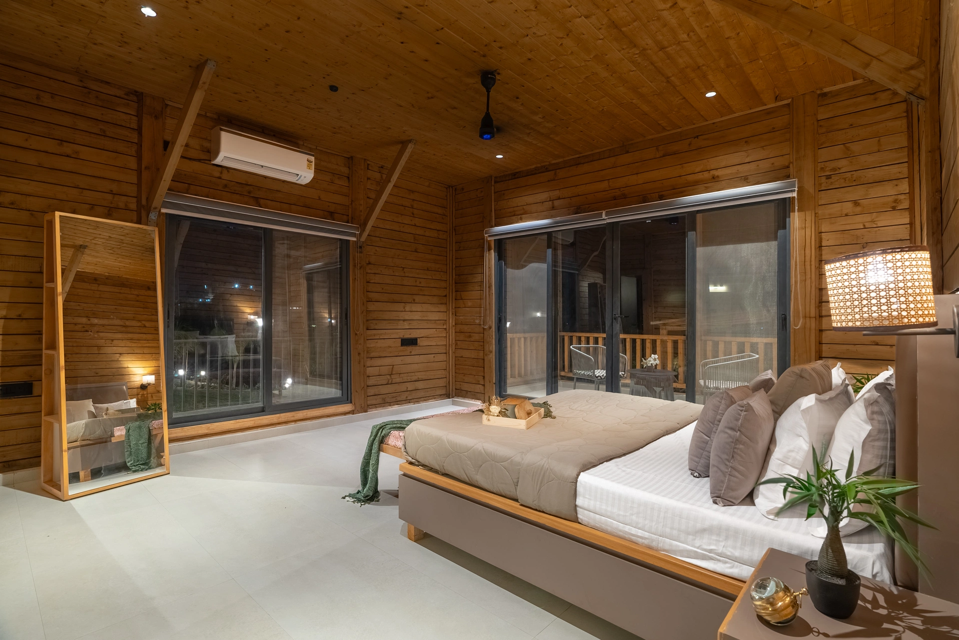 - Each bedroom is stylishly decorated with wooden panelling, standing mirrors and large windows forming one wall side.