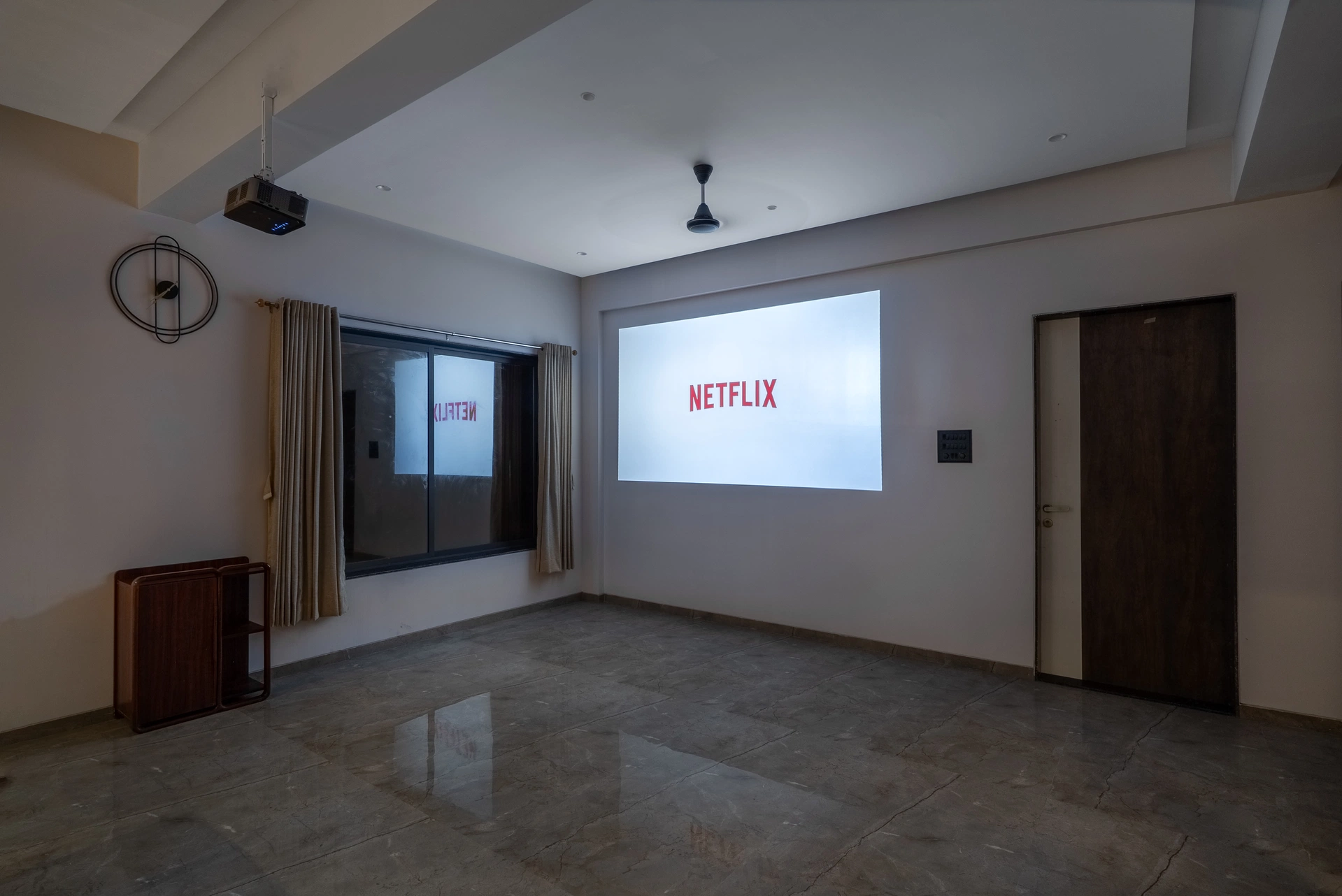 - This Lonavala villa assures entertainment with a Projector Setup for cinema-style evenings. There’s also a 55″ Smart TV and a 120-watt speaker